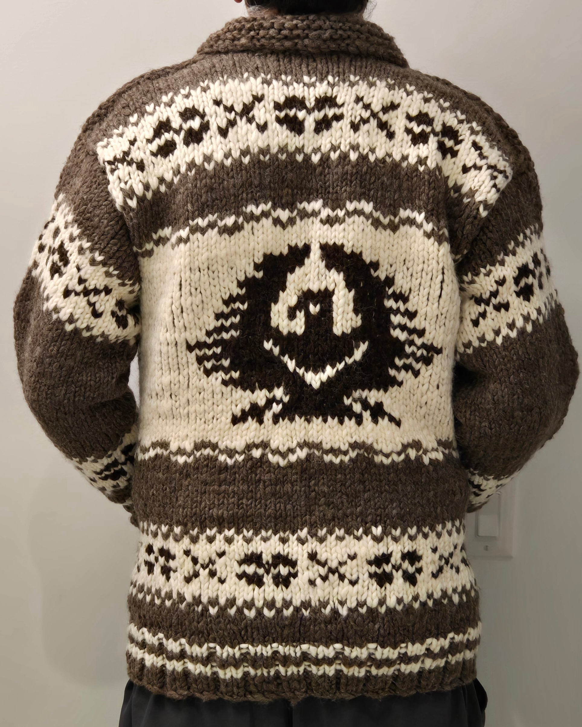 100 % handspun handknit sheeps wool sweater with eagle design front and back, zipper front with pockets. Vurginia jacobs