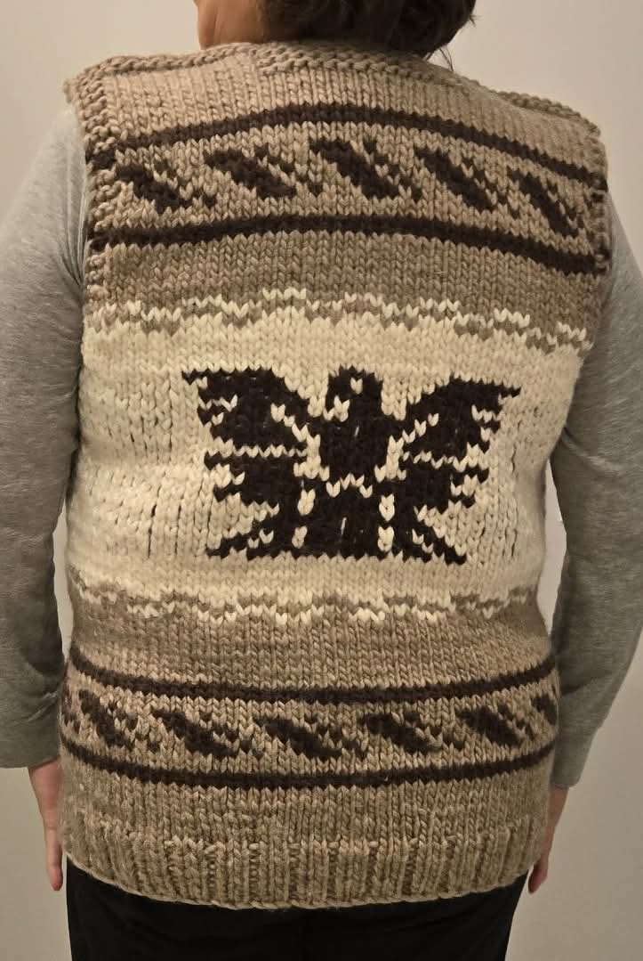 Cowichan knit vest with eagle design by virginia jacobs,  no pockets