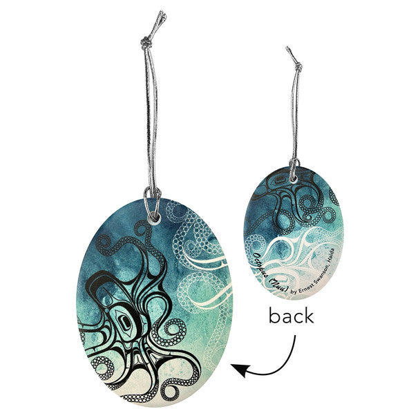 Bring artistry to your holiday décor with our Ceramic Ornaments, available in classic circle (3” x 3”) and elegant oval (2.4” x 3.2”) shapes. Each ornament is beautifully printed on both sides, with the artist’s information thoughtfully displayed on the back, creating a keepsake that celebrates Indigenous art and culture. The smooth matte finish enhances the artwork, adding a refined touch, and each ornament comes ready to hang with a sleek silver string. Individually packaged with a header card, these ornaments make perfect gifts or timeless additions to your own seasonal collection.