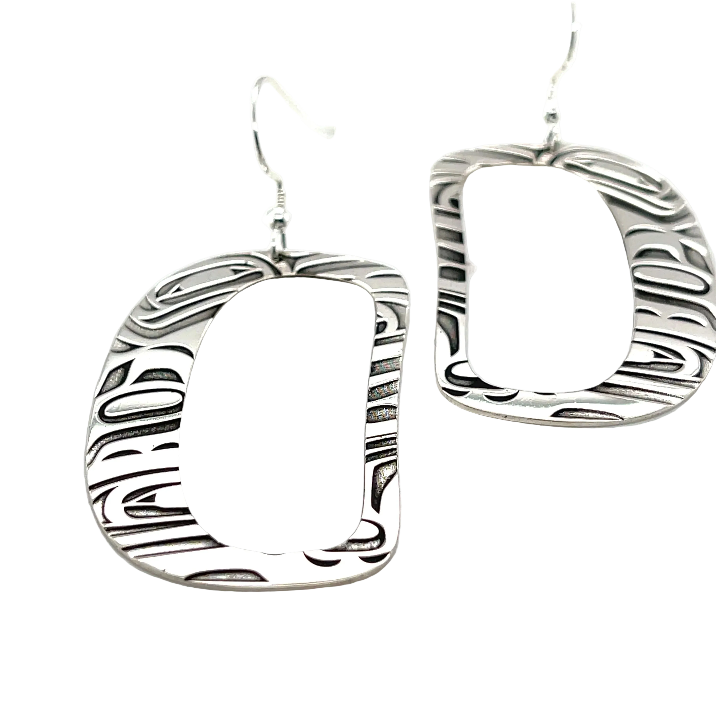 Expertly crafted in Vancouver, these sterling silver earrings feature a traditional Indigenous design of an abstract ovoid design. Showcasing the artistry and cultural heritage of the Pacific Northwest. Elevate any outfit with these unique and meaningful earrings.