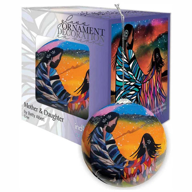 Our 80mm Glass Christmas Ornamentss are hand-painted and based on authentic Indigenous art. Each ornament comes in a protective box with a window to view the product. The box features the artist’s headshot, biography, and the original artwork that inspired the design.